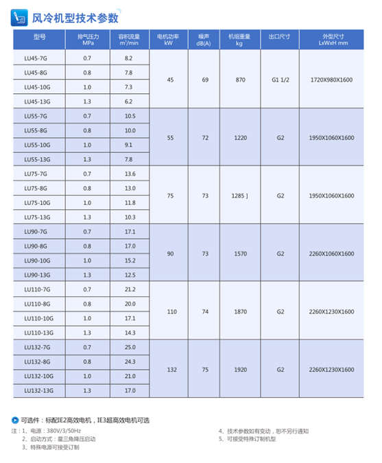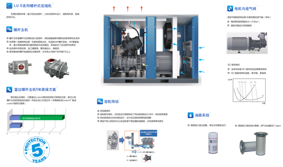 ·LU90-250kW系列螺桿式壓縮機主機具有最佳的螺桿線速度及很高的壓縮效率,比市場上同類產品節能5%以上。